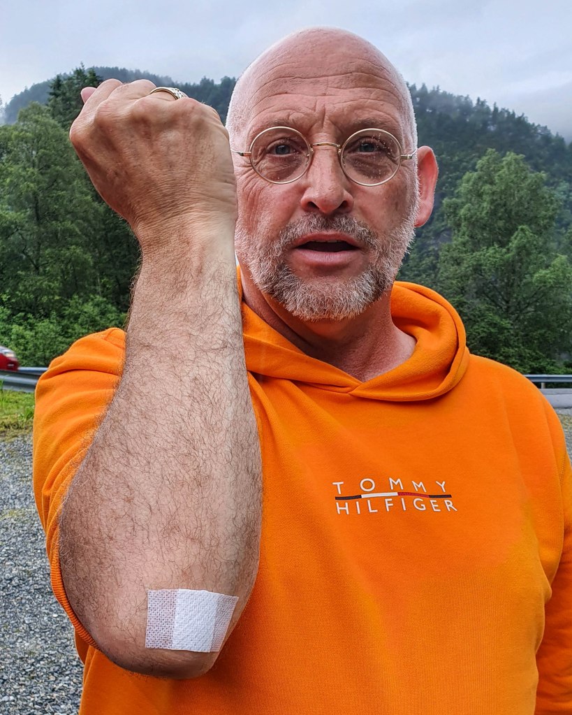 Helaas regende het gedurende de hele rit. Maar uiteraard zijn we toch een paar keer gestopt om koffie te drinken en wat van de omgeving te genieten. Je ziet dat Hans voor deze rit zijn outfit aan de bus heeft aangepast.