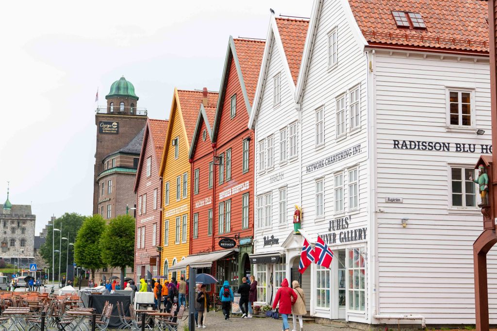 Er wordt weer de hele dag regen verwacht. Maar we laten ons niet kisten, en hopende op beter weer begeven we ons naar Bergen. Het leek ons even mee te zitten, maar dat was niet van lange duur. Het plan om de Fløyenbaan naar boven te nemen viel letterlijk in het water.
