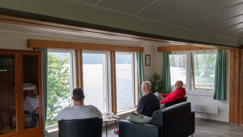 De huiskamer heeft enorme panoramaramen. Het is net of we op de Hurtigruten tussen de oude dames zitten… 😅