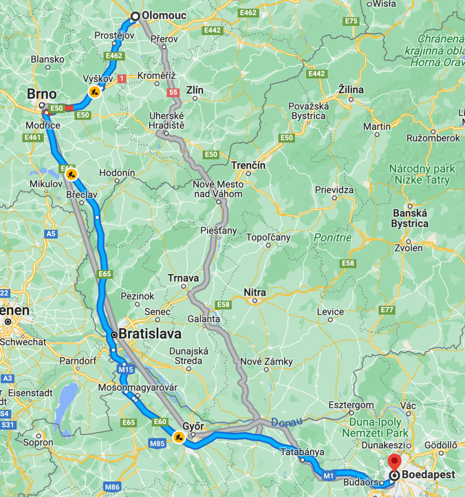 We vertrekken rond 10:00 uur richting Boedapest. Om 11:30 passeren we de Tsjechisch-Slowaakse grens, en om 13:00 uur de Slowaaks-Hongaarse grens. We lunchen als we net Hongarije ingereden zijn.
