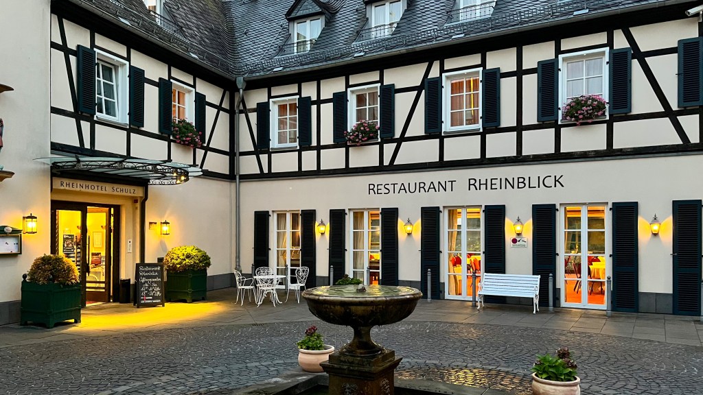Het Rheinhotel Schulz ligt prachtig aan de Rijn, en na het meer dan uitstekende diner op het terras wandelen we nog een beetje langs het water.