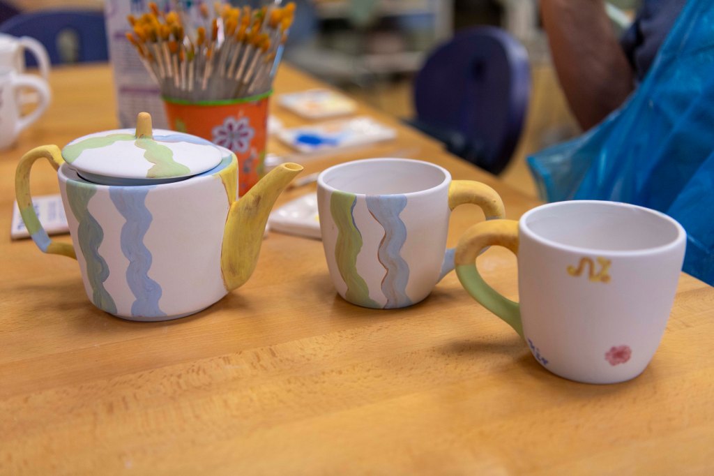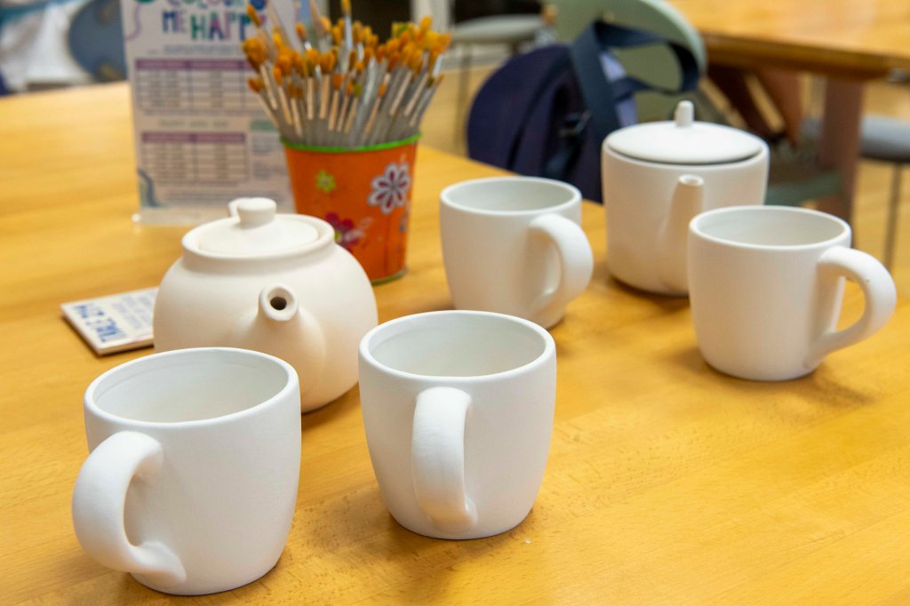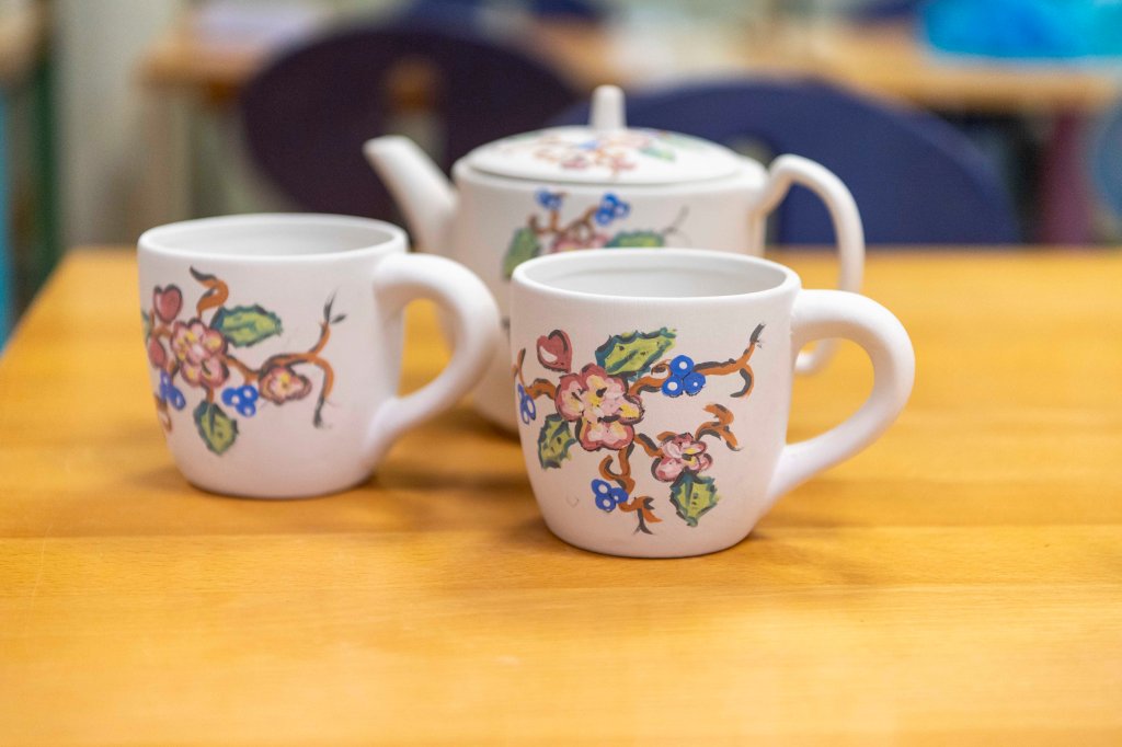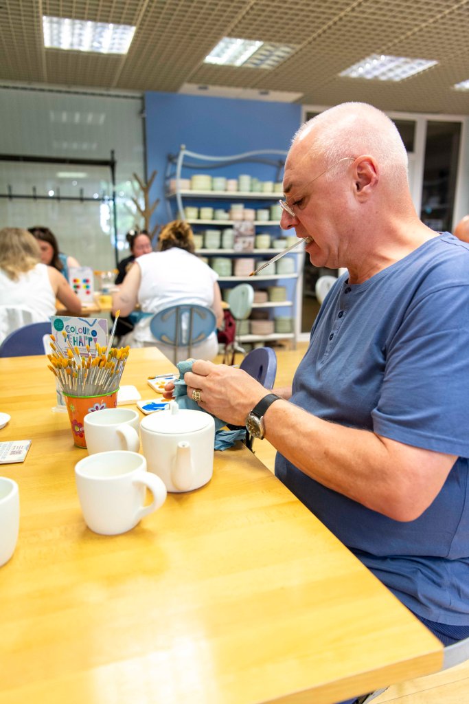 In Totnes, bij China Blue, dat hier ongeveer 20 mijl vandaan ligt, kun je heel leuk aardewerk beschilderen. De twee dansmariekes beginnen al te glimmen bij het idee. Dus we rijden daarheen, en laten ze daar een paar uur achter terwijl de andere twee de klim naar boven aanvangen om het kasteel te bezoeken.